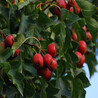 歪把紅山楂, 果實倒卵形,單果重15克左右,肩部較瘦,較,果?;恳粋?cè)著生較的紅色肉瘤是其典型特征,果皮鮮紅色,有光澤,蠟質(zhì)較厚,果稀且較大,萼片開張反卷,果面有殘存苞片,萼筒陡深,果肉,肉質(zhì)細(xì)密,味酸爽口,總糖7.52%,總酸2.18%,可溶性固形物14.5%,每100克含鈣24.6mg,磷1.3mg,鐵2mg,維生素C60.8mg。果實10月上中旬成熟,耐貯性好。樹冠緊湊,萌芽率和成枝力均,花序平均座果率8.9個,適應(yīng)性強,是加工兼鮮食的優(yōu)良品種。