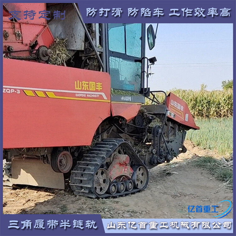 收割機(jī)防陷半履帶鏈軌適用于收獲期多雨,低洼地塊,水稻田等泥濘狀態(tài)下使用,用于防止在土壤水分過(guò)大時(shí)收割機(jī)下陷。收割機(jī)防陷半履帶鏈軌在土壤平均含水率小于50條件下能正常作業(yè),地表有明水通過(guò)性能效果更好。