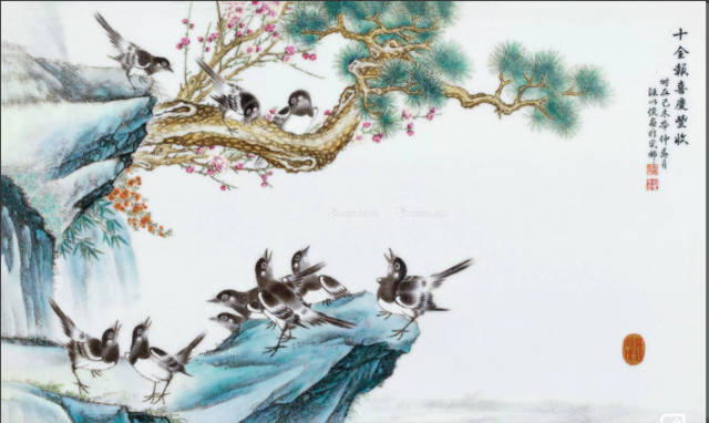 其中大瓷板畫《六鶴迎春>>較好地體現(xiàn)了他的藝術成就。此件作品在立意上表現(xiàn)了百花吐艷,青松呈翠,鶴鳴陽春之景。布局采取“金角銀邊”構(gòu)圖形式。鶴石花松枝葉交錯,穿插自然,雖豐滿而不雍容,多而不亂。令人贊嘆的是表現(xiàn)技法的高超,各種樹木的紋理被表現(xiàn)得非常精妙。桃樹的光滑,牡丹桿的斑駁,其質(zhì)感使人如臨其境。尤其是古松主桿的鱗皮,仿佛是伸手便可剝落下來,真正達到了亂真之地步。
